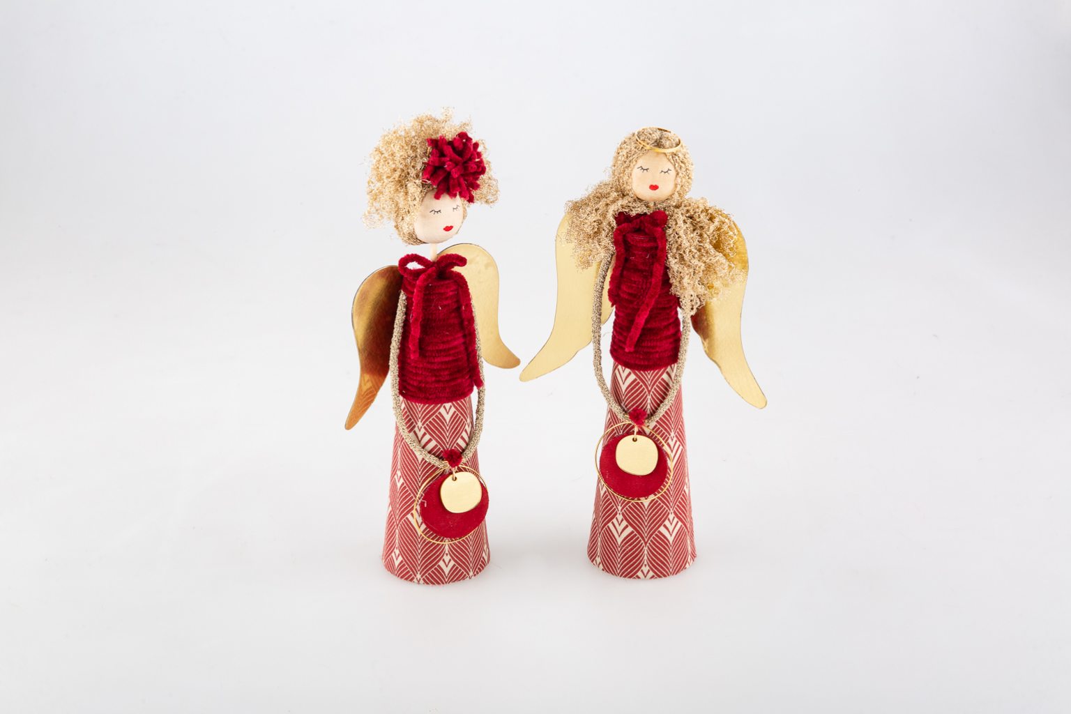 • Both fairies are hand-crafted from wood and dressed in red velvet