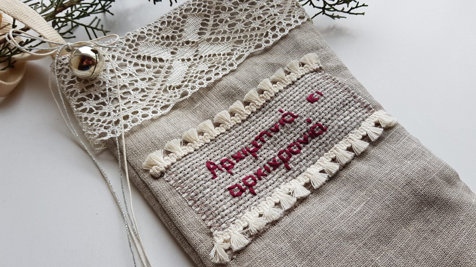 • It is decorated with hand-embroidered phrase "Αρχιμηνιά κι αρχιχρονιά" , a metallic 25 and a small bell