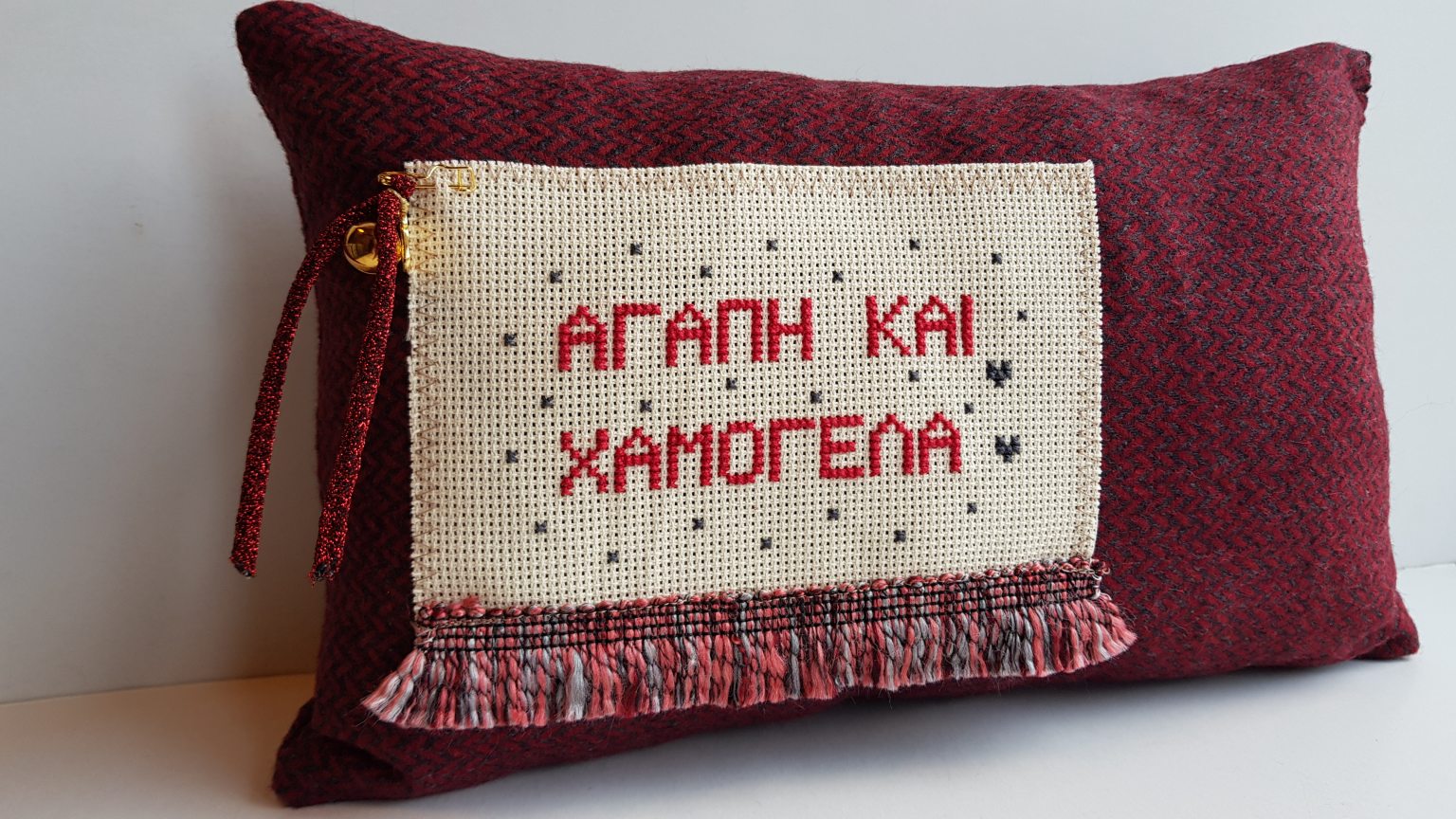 A delightful addition to your Christmas decor, the elegant pillow is masterfully hand-embroidered with lovely wishes, love & smiles, in greek "Αγάπη & χαμόγελα"! It makes for a stunning Christmas home gift.