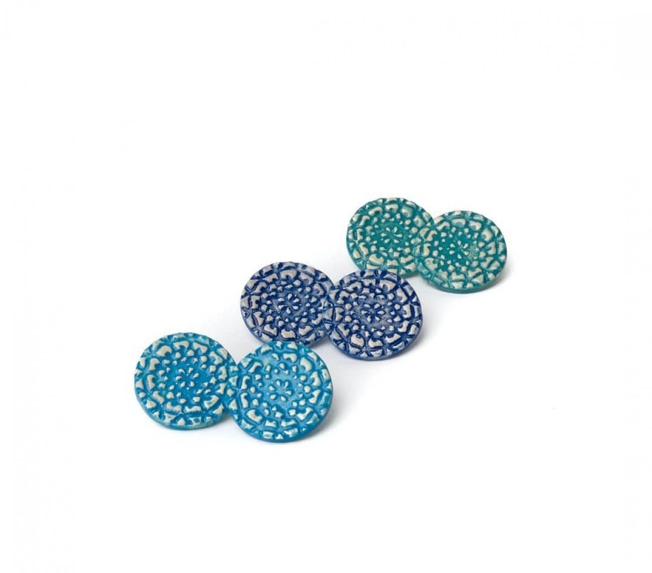 Stunning and oh-so-Greek earrings, uniquely handcrafted from clay, beautifully imprinted and painted in blue, the color of the Cyclades! Perfect companions to the lovely white-blue caftan of our collection!