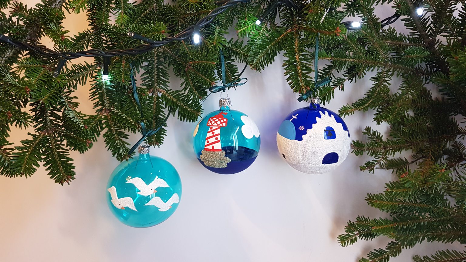 Let's go on a trip to the Ιonian Islands - gorgeous turquoise & blue glass baubles featuring a boat, a lighthouse and seagulls! What interesting glass ornaments for your tree!