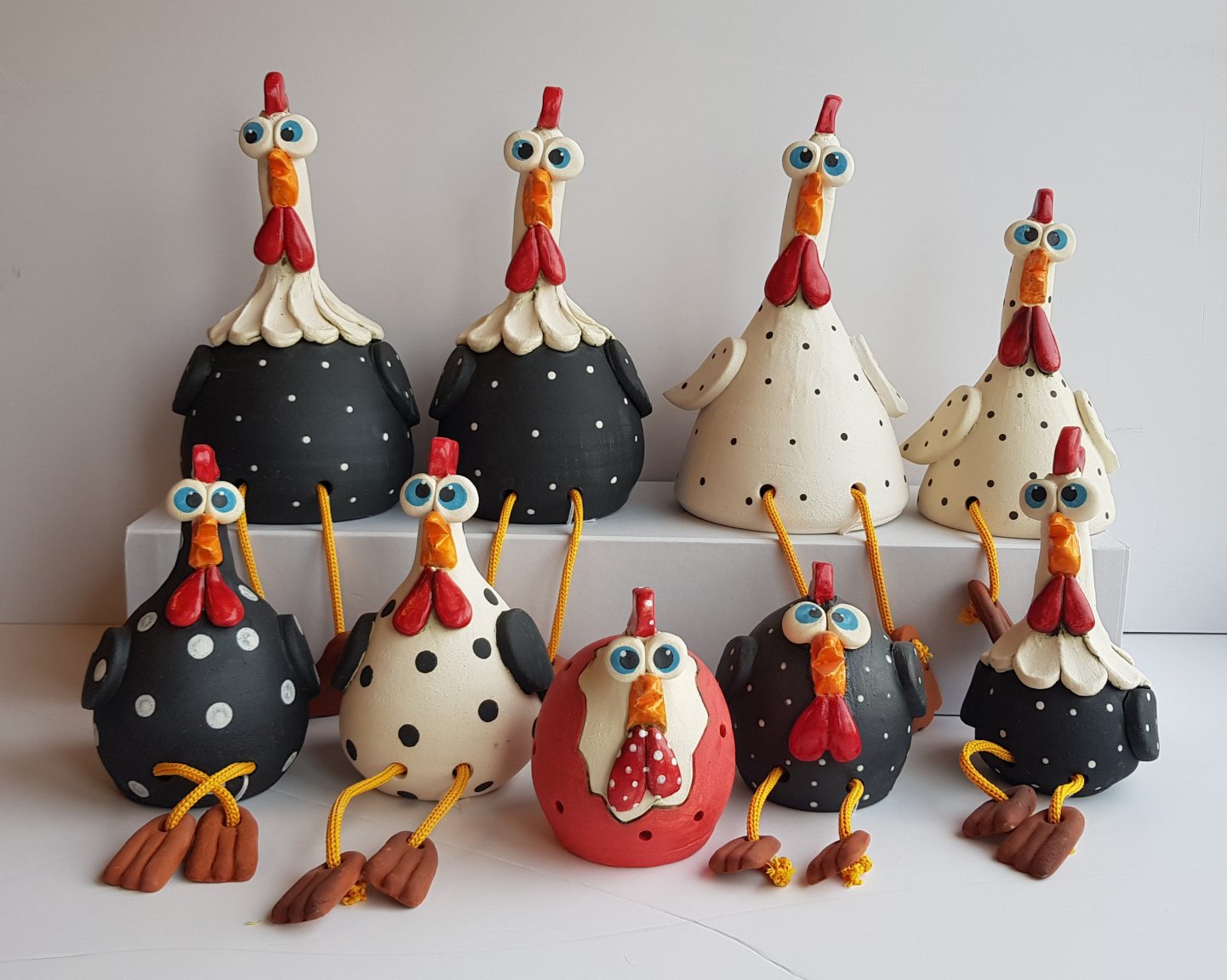 •  The chickens are made of ceramic, engraved and painted by hand.